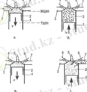 1-сурет. Төрт тактілі қозгалтқыштың жұмыс істеу сызбасы: а - жанғыш қоспаны сору; б -жанғыш қоспаны сығу; в - от алу және жұжыстың жүріс; г-пайдаланылган газды шығару