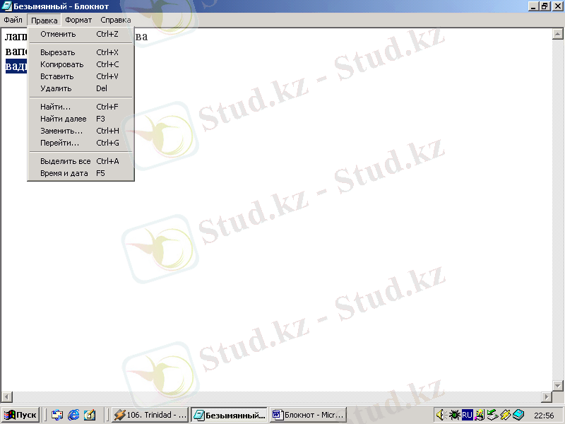 - Алмастыру буферіне көшірілген, қиып алынған текстті белгілі бір орынға қою үшін Правка менюінен Встаивть командасын таңдау жеткілікті.