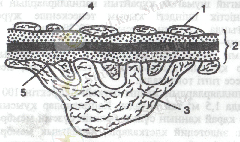 1 - сурет. Шумақтың сүзгіш мембрасының құрылысы (схема) 1 - эндотелий; 2-базальдық мембрана; 3-подоцит; 4-эндотелидегі тесік, 5-подоциттің саңылаулы мембранасы.