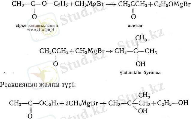 Карбон қышқылдарының күрделі эфирлері әуелі кетон береді де, ал одан әрі үшіншілік спирт түзеді: