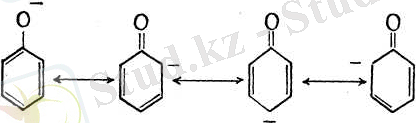 оң жаққа қарай ауыңқы және ондағы фенолятанионның концентрациясы айтарлықтай болады. Бұлардың тұрактылығы немесе негіздік қасиетінің төмендеу себебі бензол сақинасындағы бензолды аниондардың тұрақтылығына байланысты. Олардың басты себебі, бензол сақинасындағы п -байланыстар мен оттектегі қосарланбаған теріс зарядтардың арасындағы өзара әсерлері. Оларды мына төмендегідей жазуға болады: