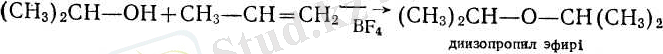 Олефиндерге спирттердің қосылу реакциясы да жиі қолданылады. Айталық, қос изопропил эфирін алу өте қиын. Сондықтан да оны пропиленге изопропил спиртін қосу реакциясы арқылы да алады. Бұл реакцияда қанықпаған комплексті қосылыс іспеттес, хлорлы алюминий немесе газ қалпындағы фторлы бор (Льюис қышқылы) катализатор ретінде қолданылады:
