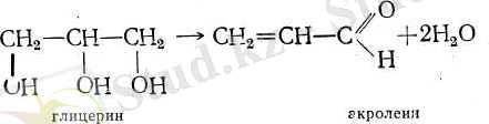 Глицеринді қыздырғанда жүретін сусыздандыру реакциясында үлкен молекулалы заттар түзілмеуі мумкін. Реакция соңында оңай ұшатын қанықпаған альдегид акролейн пайда болады: