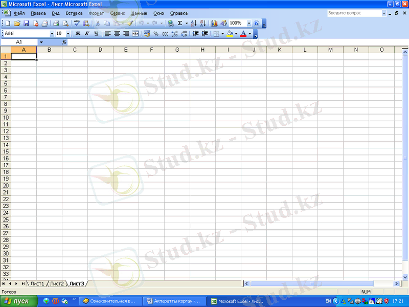 EXCEL программасын іске қосу үшін «Пуск» менюінің «программы» тобынан «Microsoft Excel» таңдаңыз. Excel терезесі ашылады. Excel: