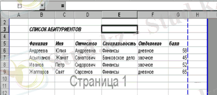 Excel-де жұмыс істегенде «Вид» - «Разметка страницы» командасын таңдасаңыз өте қолайлы. Сонда экранда бірқатар өзгерістер болады. Яғни, поля көк үзік сызықпен көрсетіледі және парақтың қай бетінде (Страница 1) жұмыс жасап отырғаныңыз көрініп тұрады.