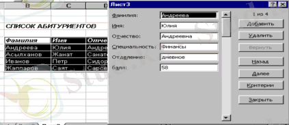 Таблица арқылы мәлімет енгізу қолайсыз болса, таблицаны ерекшелеп алып, «Данные»→«Форма» командасы арқылы Форма жасап, мәліметтерді таблицаға содан енгізіңіз. Егер добавить кнопкасын басып формада жаңа мәлімет енгізсеңіз, ол мәлімет таблицаның астыңғы жағына автоматты түрде пайда болады.