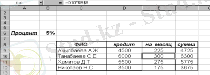 Клетканың адресін түсіндіру үшін, мына таблицаны келтіремін: Мекемеден қызметкерлер 1 айға 5% өсімімен қайтаруға қарыз алған. На месяц бағанасында өсімі есептелген. Яғни қарыз сомасын В6 клеткасына (5%) көбейткен. Егер мен Е9 клеткасына =D9*B6 деп жазып, басқа төмендегі клеткаға толтыру маркері арқылы көшіре бастасам, В6 адресі В7, одан төмен В8 болып өзгертіле бастайды. Ал бұл клеткалар өздеріңіз байқап отырғандай бос тұр. Формула жазғанда клетка адресі өзгермеу үшін жоғарыдағы суреттің формула жолында көрсетілгендей $ символын қолдану қажет.