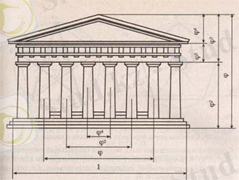 Парфенон қысқа жағынан 8 бағана және ұзынынан 17 бағанадан құралған. Ғимараттың биіктігінің ұзындығына қатынасы 0, 618- ге тең. Егер Парфенонның «алтын қимасымен» бөлсек, онда сол немесе сол сияқты фасадтардың түрлерін аламыз. Оның жанын қазған кезде көне әлем сәулетшілері мен мүсіншілері пайдаланған циркульдер табылды. Помпей циркульінің өзі алтын бөліктерге пропорцияланған.