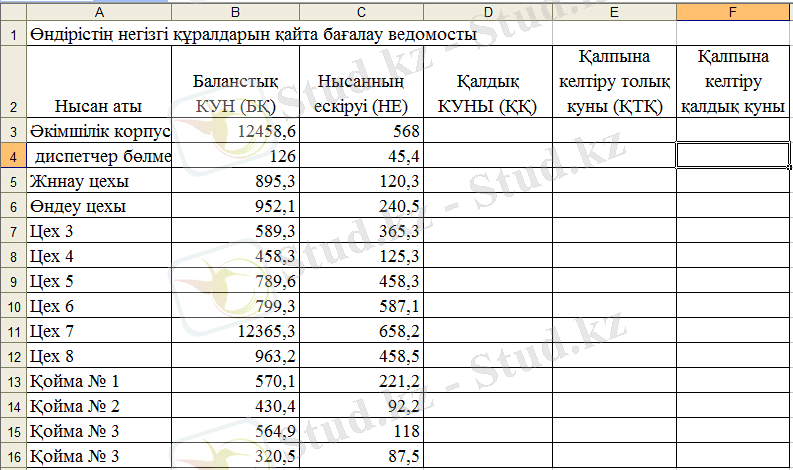 Кестедегі есептеулерге қолданылатын формулалар төменде көрсетілген: