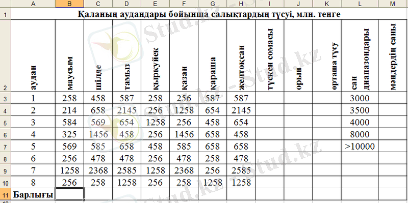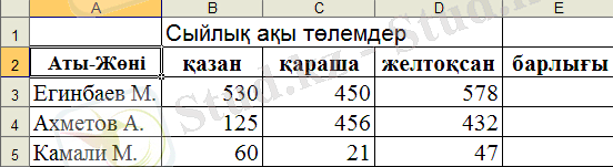 Кестедағы Барлығы бағанында СУММ функциясын пайдаланып, оның аргументінде ұяшықтар диапазонын көрсетіп, формуланы қалған ұшықтарға көшіру арқылы қажет мәліметтерді толтырып алыңыз;