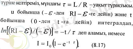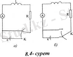 t = 0 мезетте к кілтті тез сағат тілі бағытында бұрап, төменгі күйден жоғарғы күйге қоямыз (8. 4, а-сурет) . Бұл жерде біз не істедік: кілт өте қысқа уақытқа £ көзді түйықтайды да, сосын оны тізбектен ағытып тастайды. L индуктивтік арқылы ток кеми бастайды, демек, осы кезде өздік индукция э. қ. к. -і Ә s = -Ldl/dt пайда болып, ол Ленц ережесі бойынша тоқтың кемуіне кедергі жасайды. Әрбір мезетте тізбектегі ток I = Е s R- заңы бойыныа анықталады, немесе