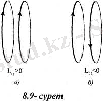 L 12 таңбасына қатысты: егер екі контурдағы да тоқтардың оң бағыты кезінде олар бір-бірін магниітін отыратын болса, L n > 0, керісінше жағдайда L 12 < 0. Нақты жағдайларда контурды айналып өтудің оң бағытын L 12 шамасының өзімізге қажетті таңбасы алдын-ала белгілі болатындай етіп таңдауға болады (8. 9-сурет) .