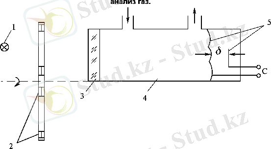 9 - синхронды электрқозғалтқыш, 10 - обтюратор, 11 - инфрақызыл сәулеле-нудің сәуле қабылдағышы, 12 - мембраналы конденсатор, 13 - күшейткіш