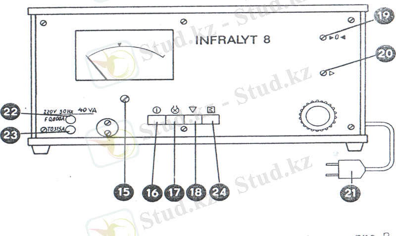 14 - индикатор құралы, 15-индикатор құралы үшін нөл нүктесін механикалық орналастыру, 16-бақылау желісінің /Schl/ шамды желілік айырып-қосқышы өшіру/қосу, 17-сораптың айырып-қосқышы, 18-сезімталдықты бақылау үшін айырып-қосқыш /Sch 3/, 19-нөл нүктесінің электрлік құрылғысы /R 609/, 20- жіңішке // сезімталдықты реттегіш