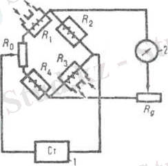 1 - кернеу тұрақтандырғыш көзі, 2 - қайталама құрылғы; R1 және R3 - жұмыс терморезисторы; R2 және R4 - салыстырмалы терморезисторы; R0 және Rg потенциометр; кіріс және шығыс газ қоспасы көрсеткіші
