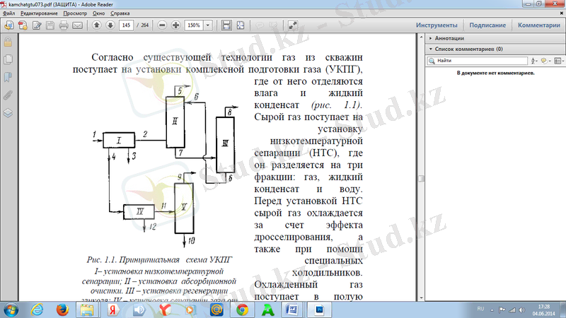2 Аранайы бөлім 2. 1 Газды дайындау процестерінің негіздері және оларды модельдеу мәселесінің қойылуыҚазіргі бар технологияға сәйкес ұңғымадан газ газды кешенді дайындау қондырғыларына (ГКДҚ) келіп түседі, ол жерде газдан ылғал мен сұйық конденсат бөлінеді (8-сурет) . Өңделмеген газ төменгі температуралы сепарация қондырғысына келіп түседі, ол жерде газ үш фракцияға бөлінеді: газ, сұйық конденсат және су. Төменгі температуралы сепарация қондырғысына келіп түсуден алдын өңделмеген газ дроссельдеу салдарының есебінен, сонымен қатар арнайы тоңазытқыштардың көмегімен суытылады. Суытылған газ қуыс ыдыс - сепараторға келіп түседі. Газ суытылған кезде оның газ тәрізді және сұйық фазалары арасындағы термодинамикалық тепе-теңдік бұзылады. Су тамшылары мен конденсаттан тұман түзіле бастайды. Құрғақ газ сепаратордың жоғарғы жағына көтеріледі, сұйықтық тамшылары жартылай аппараттың төменгі жағына тұнады, ал жартылай сепаратор жабдықталған түрлі фильтрлерге тұрып қалады. Осылайша су мен конденсат аппарттың төменгі жағына келіп түседі. Ауырлық күші өрісінде олар қабаттарға бөлінеді, сол себептен сепаратордың ең төменгі бөлігінде сулы фаза, сәл жоғарырақ жеңілірек конденсат, одан да жоғарырақ сұйықтық тамшысы бар газды тұман пайда болады. Тереңірек кептіру үшін бірнеше сепараторларды тізбектеп біріктіреді. Әрбір сепаратордың алдында газды суытады. Төменгі температуралы сепарациялау қондырғысы газ кептіру деңгейін ГОСТтың талабына сай қамтамасыз ете алмағандықтан, газ сепаратордың соңғы сатысынан терең кептіретін қосымша сатыға келіп түседі. Жиірек мұндай кептіру түрлі сұйық гликольдардың көмегімен газдан онда қалған сұйықтықты сіңіру есебінен іске асырылады, жиірек диэтиленгликольмен (ДЭГ), триэтиленгликольмен (ТЭГ), пропиленгликольмен (ПГ) және т. с. с.