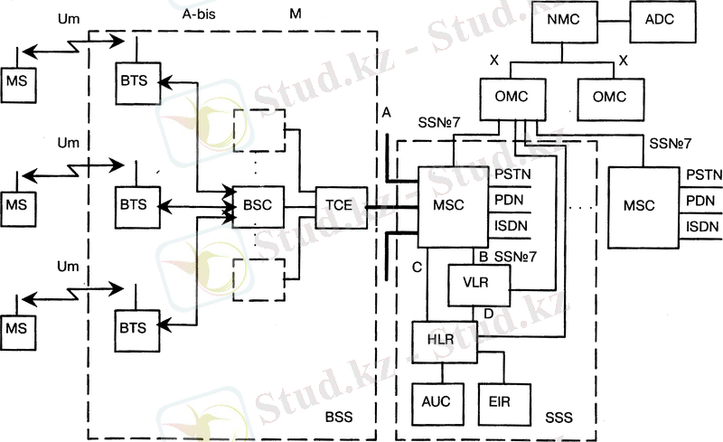 - MSC (Mobile Switching Centre) - жылжымалы байланыстың коммутация орталығы; BSS (Base Station Subsystem) - базалық станция қондырғысы; MS (Mobile Stations) - жылжымалы станциялар; OMC (Operation and Mantenance Centre) эксплуатация және техникалық қызмет көрсету.