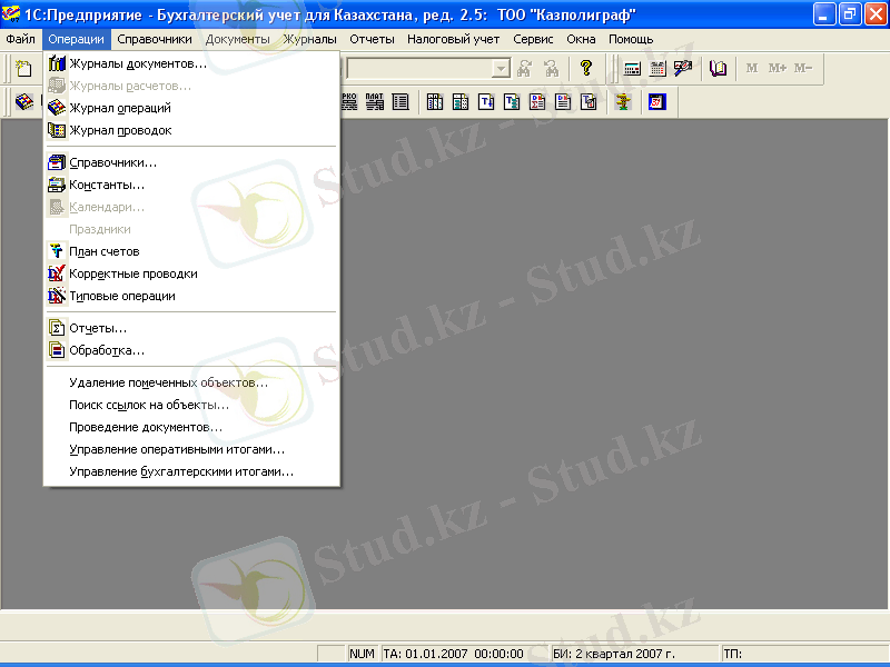 Осы түрде константалар, анықтамалықтар, есептер және өңдеулер жинағын программаның негізгі менюінің «Операциялар» менюінің сәйкес пунктін таңдап тексеруге болады.