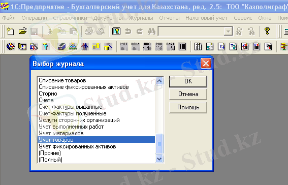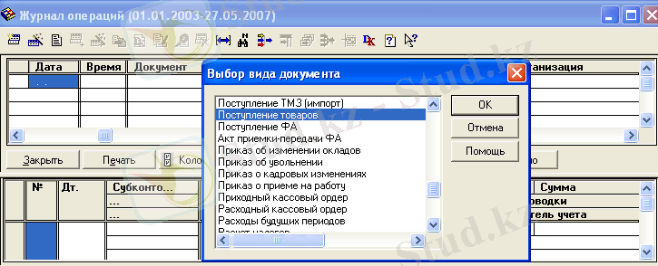 Тізімнен журналды таңдап алып, тышқанмен сурет, из книжки батырманы басу арқылы таңдалған журналға кіретін құжаттар тізбегін көруге болады. Мысалы, «ОС есебі» журналын таңдағанда және жаңа құжатты енгізгенде экранда келесі көрініс пайда болады: