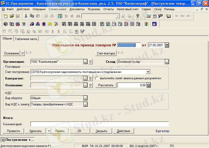 Құжат формасы программаның негізгі менюіндегі «Құжаттар» менюінің «Тауарлардың келіп түсуі» пунктін таңдау арқылы шақырылады. Экранға толтыруға арналған құжат формасы шығарылады: