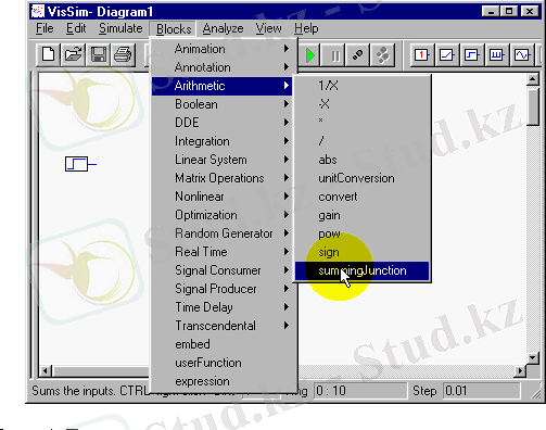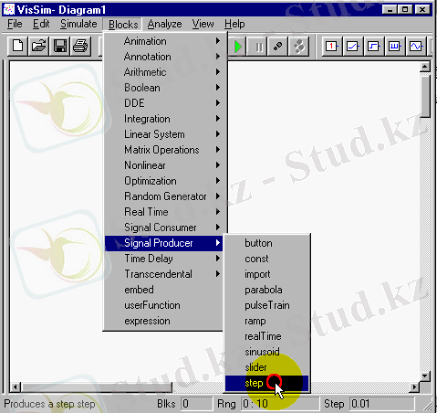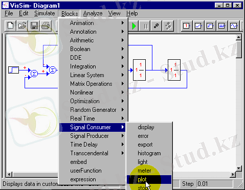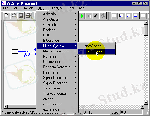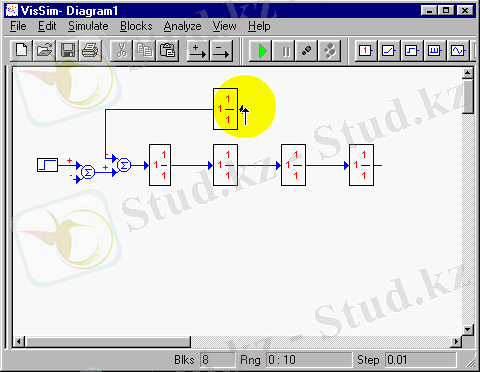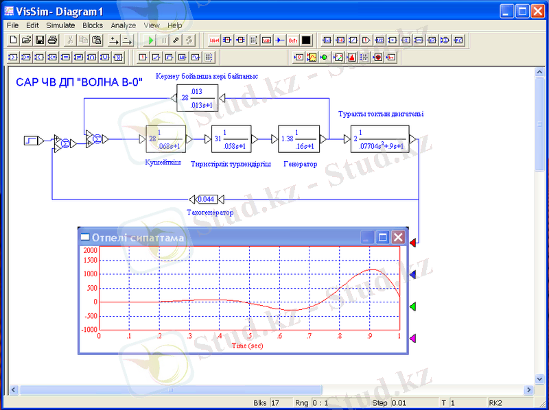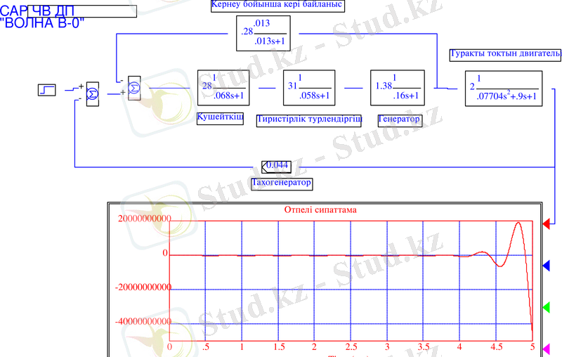 Осыған байланысты суретте көрсетілген автоматты реттеу жүйесінің құрылымдық сұлбасын тұрақтылыққа зерттеп, оның тұрақтылығын бағалап, дәлдігін көтеру үшін VisSim программалау ортасында әртүрлі сәйкес модельдері алынды.
