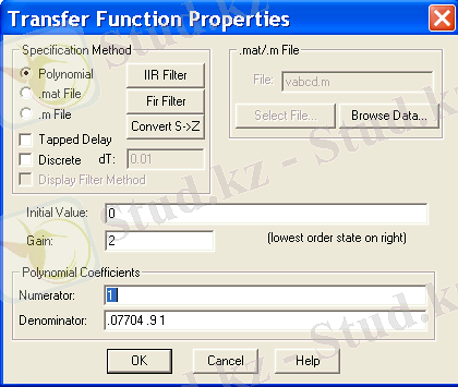 Двигатель болашақ модельіне екі рет шертіп, диалогтік терезеге беріліс функциясымен сәйкес параметрлерді енгіземіз.