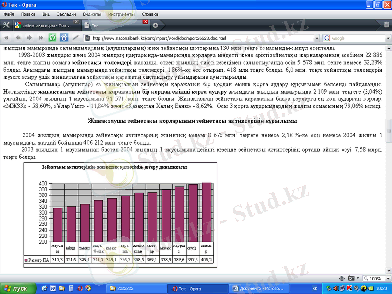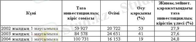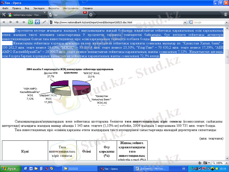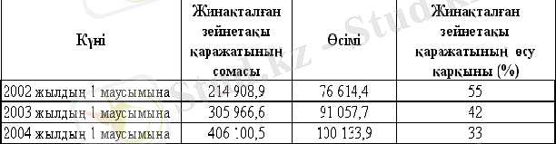 201 072 млн. теңгені немесе 52, 57%-ті құрайды. Өткен аймен салыстырғанда МБҚ көлемі 11 641 млн. теңгеге немесе 6, 15%-ке көбейді. 2003 жылғы 1 маусыммен салыстырғанда МБҚ-дың өсімі 51 593 млн. теңге немесе 34, 52% болды. Қазақстан Республикасы эмитенттерінің корпоративтік бағалы қағаздар көлеміндегі ұлғаю 226 млн. теңге немесе 0, 19% болды. Қазақстан Республикасының екінші деңгейдегі банктеріндегі салымдар көлемі 2004 жылғы мамырда 4, 1%-ке көбейіп, 31 156 млн. теңге немесе 8, 14% болды. ЗАИБЖАҰ зейнетақы активтерінің салымдарын екінші деңгейдегі банктерге тек ұлттық валютада жүзеге асыратынын атап өткен жөн.
