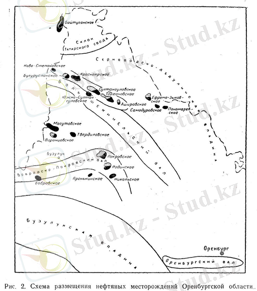 Оренгбург облысының мұнай және газдығы тас көмірді, девондық және пемдік қабаттармен байланысты. Мұнайдың негізі қоры тас көміргі қабатта негізделген. Бүкіл облыстық мұнайдың жалпы өдіріс қорынын девондық қабаттық қоры 20%, ал премдік - 5% құрайды.