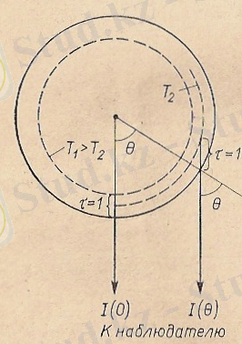 бұрышпен қиылысатын болса (2- сурет), онда оптикалық қалындығы r=1 шамасына температурасы төменірек болатын неғұрлым жоғарырақ қабаттарда жетеді. Сондықтан Күн дисксі шетінің сәулелену интенсивтілігі ортасының сәулелену интенсивтілігінен аз болады.