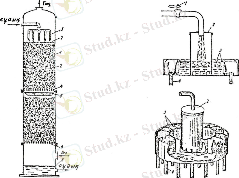 11, 10-сурет. а) Насадкалы абсорбер: 1- цилиндрлі корпус; 2- насадка; 3- сұйық тарататын құрылғы; 4- таяныш тор; 5- насадка қабаттары арасындағы сұйықты қайта таратушы; 6- гидравликалық қақпа (затвор) ; 7- тор.