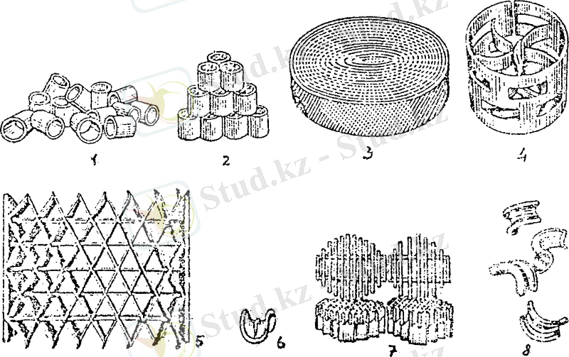 1-ретсіз орналасқан Рашиг сақиналары; 2-ретті орналасқан крестті бөгеті бар сақиналары; 3- Гудлоу насадкасы; 4- Паль сақинасы;