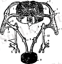 Симпатикалык түйін тізбектерінің сегізкөз бөлігі (§ап§ііоп §агаІі$) төрт жүп түйіннен күралады. Симпати-калык түйін тізбегі сегізкөз бөлігінен кейін төмеңдеп I қүйымшак омыртка түсында он және сол жак түйің тіз-бектері сынар түйінге (§ап§Ноп ітраг) бірігеді. Олардан сегізкөз және күйымшақ жүйке талшықтары шы-ғады. Жамбас қуысында симпати-калық түйін жүйкелерінін бірігуінен күрсақасты немесе кіндіктен төменгі жүйке өрімі (ріехи. ч һуро^аяігісиз) түзіледі. Бүл түйін күрсактьщ колка тамырының төменгі бөлігін коршап жатады. Қүрсакасты жүйке өрімінщ тармақтары бөксе артеринсынын іюкі тармағымен кабат тарқалып, кіші астаушадағы тік ішек, куык. үрык жол, куык түбі безін, шәует куығын, үңгірлі денені және жатыр, клитор, қынап, аналықбез мүшелерін жүйке-лермен жабдыктайды.