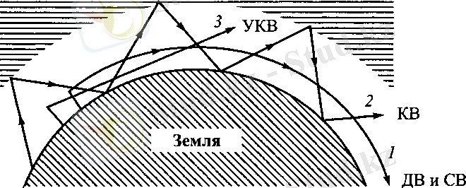 Толқынның ұзындығына байланысты (жиілікке) сигнал радиожелімен келесі жолдармен таратылады (сур. 1. 1) : ҰТ және ОТ - үстіңгі сәулемен (1), ҚТ кеңістіктегі сәулемен (2), УҚТ және ОТ - шектердегі тура көрінушілігі (3) .