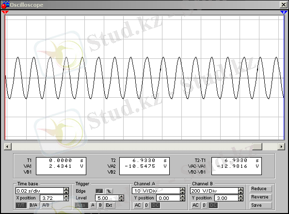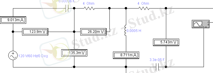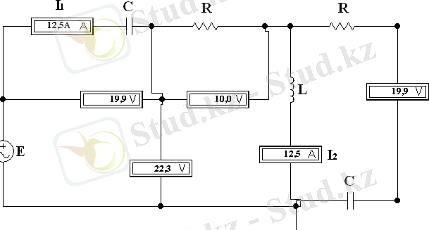 Жоғарыдағы схемада жиілік 1200Гц болғанда резонанс байқалады. Резонанс кезіндегі құралдардың көрсеткіші схемада көрсетілген. С және L табу керек, егер R=4 Ом болса.