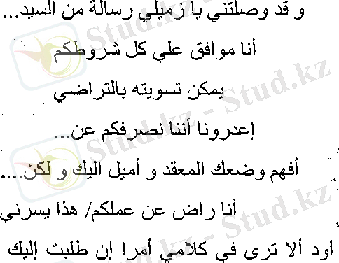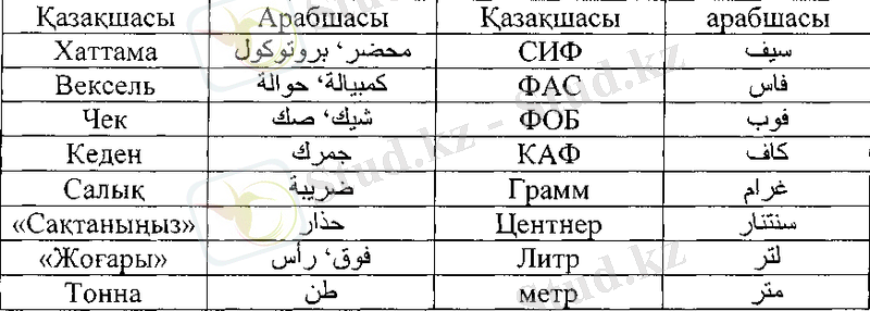 Жоғарыда келтірілген тілдік категориялардың араб жэне қазақ тілдеріндегі коммерциялық хат алмасу тілінде кездесуі заңдылық. Оған мысал ретінде хаттардың бірнеше түріне шолу жасайық.