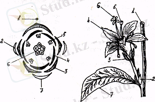С у р е т. Гүлдін құрылысы меи диаграммасы: 1 - гүлдің өсі - сабақ; 2 - гүл жапырақшалары; 3 - тостағанша жапырақшалары; 4 - күлте жапырақ-шалары; 5 - аталық; 6 - аналық; 7 - гүл жапырақ (жабын жапырақ) .
