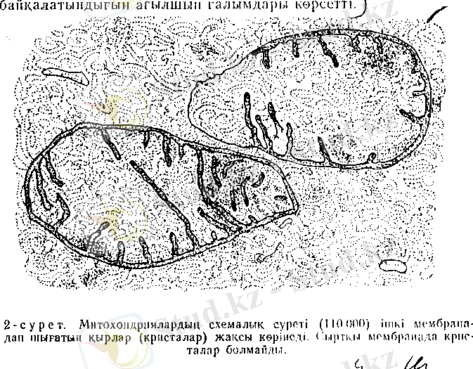2-сурет. Митохондриялардың схемалық суреті (110 000) ішкі мембранадан шығатын қырлар (кристалар) жақсы көрінеді. Сыртқы мембранада кристалар болмайды.