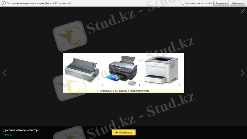 Дербес компьютердің принтер түрлері мен қызметі Лазерлiк принтерлер: бұларда осындай көшiрме қолданылатын көрiнiстердi қалыптастырудың электрографикалық жолы қолданылады. Лазер аса жiңiшке жарық сәулесiн жасауға қызмет етедi, бұл сәуле алдын ала зарядталған жарыққа сезiмтал барабан бетiнде көрiнбейтiн нүктелiк электронды көрiнiс контурларын сызады - электр заряды лазер сәулесiмен жарықталған барабан бетiндегi нүктелерден ағып түседi, электрондық көрiнiстiң қайта зарядталған учаскелерге жабысатын бояу ұнтағымен (тонер) айқындалынғанынан кейiн басу орындалады - яғни тонердiң барабаннан қағазға көшiрiлуi және көрiнiстiң қағазда тонердiң балқуына дейiн қыздырылуы арқылы бекiтiлуi жүзеге асады. Лазерлiк принтерлер 50 нүкте/мм (1200 dpi) және 1000 белгi/с-қа дейiн басу жылдамдығымен сапалы басуды қамтамасыз етедi. Түстi лазерлiк принтерлер кең таралуда. Мысалы, Tektronicx (АҚШ) фирмасының Phaser 550 принтерi горизонталь мен верткалi бойынша 1200 dpi шешу қабiлетiн бередi: түстi басу жылдамдығы - А4 форматты 5 бет минутына, монохромды басу жылдамдығы - 14 бет/мин. МП-ге принтерлер параллельдi де, тiзбектi де порт арқылы қосыла алады. Параллель порттар параллель жұмыс iстейтiн (ақпаратты бiрден байтпен қабылдайтын) принтерлердi қосу үшiн қолданылады. Мысалы, Centronics типтi адаптерлер бiрден 3 принтер қосуға мүмкiндiк бередi. Тiзбектi порттар (2 дана) тiзбектi жұмыс iстейтiн (ақпаратты ретiмен 1 биттен қабылдайды) принтерлердi қосу үшiн қолданылады. Мысалы, R3-232С (С2 қосылысы) типтi адаптерлер. Тiзбектi басу құрылғысы өте баяу жұмыс iстейдi дегендi бiлдiрмейдi. Көптеген принтерлер параллель порттарды қолданады. Көптеген жылдам әрекеттi принтерлердiң сиымдылығы бiрнеше жүз Кбайтқа дейiн өз буферлiк жады бар. Қорытындысына кең танымал ДК принтерлерiн (олардың үлесi 30%-дан кем емес) Seiko Epson жапон фирмасы шығарады. Бұл принтерлердi басқару тiлi (ESC/P) iс жүзiнде стандартқа айналды. Сондай-ақ Star Micronics, Hewlett Packard, Xerox, Man-nesmann, Citizen, Panasonic, Agfa, Samsung, Canon, Lexmark және т. б. фирмалардың принтерлерi кең таралған. Құйылма принтерлер Бұл принтерлердiң басушы бастарында инелердiң орнына жiңiшке түтiк - соплалар, олар арқылы қағазға бояудың (сияның) өте ұсақ тамшылары шашыратылады. Бұл екпiнсiз басу құрылғылары. Басушы бастың матрицасы әдетте 12-ден 64 сопладан тұрады. Соңғы жылдары оларды жетiлдiруде айтарлықтай табыстар жетiлдi: шешу қабiлетi 20 нүкте/мм, басу жылдамдығы 500 белгi/с қамтамасыз ететiн құйылма принтерлер жасалды. Олар басу сапасы бойынша лазерлiк принтерлерге жақын. Түстi құйылма принтерлер бар. Термопринтерлер Матрицалық инелi принтерлерден басқа матрицалық термопринтерлер бар. Оларды инелi матрицалық басушы бастың орнына термоматрицалы бас қойылған және басу кезiнде арнайы термоқағаз немесе термокөшiргiш қолданылады (әрине, бұл олардың айтарлықтай кемшiлiгi болып табылады) .