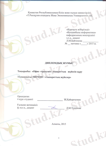 Дипломдық жұмыс 42 беттен, кіріспеден, үш бөлімнен, қорытындыдан, пайдаланылған әдебиеттер тізімінен және қосымшадан тұрады. Дипломдық жұмыс құрамында 3 кесте және 14 сурет бар.