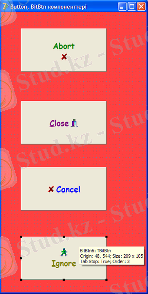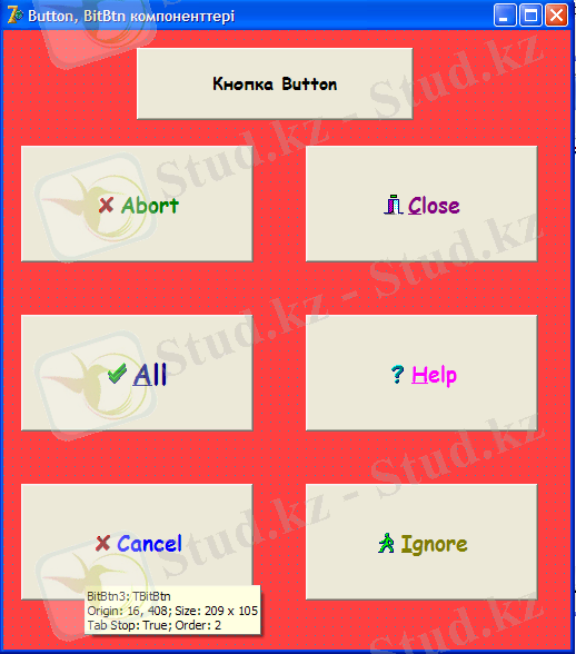 Батырмадағы суреттің қоюлуы мен жазылуы Layout және Spacing қасиетімен анықталады . Егер Margin қасиеті 1-ге тең болса, онда жазу мен сурет батырманың ортасында орналасады . Сонымен қатар суреттің жазбаға қатынасы . Spacing қасиеті пиксел санын береміз, яғни лоар суретпен жазбаның батырмадан айырып жазады . Ал егер Spacing =0 жазба мен сурет бір-біріне жабысып қалады . BitBtn батырмасының тағы бір қасиеті Kind , ол батырманың типін анықтайды .