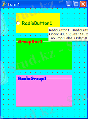 GroupBox панелі формада RadioGroup - қа ұқсайды, сонымен қатар қасиетті де Caption бар . RadioButton радиокнопкасы негізгі мағынасы оңша қажеті жоқ , алайда индекатор қызметін атқарады, яғни қолданушының қосылуы және өшірілуі . Бірақ индекатор қызметін CheckBox компонентінде қолданылады . RadioButton радиокнопкасындағы қасиеттерге тоқталайық . Caption қасиеті жазудан тұрады, батырманың жанында орналасқан . Alignment қасиеті батырманың қай жағында жазудың пайда болуын анықтайды : taLeftJustify - сол жақ, taRightJustify -оң жағы .