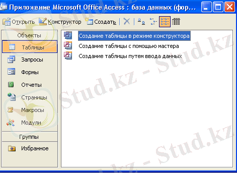 Microsoft Access 2000 праграммасы ұсынып отырған мәліметтер базасының негізгі обектілерін құру құралдарын қарастырарлық. Бұл құралдар келесідей топтастырылған:
