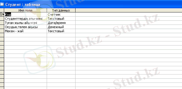 Мұнда Microsoft Access негізгі құрылымдары мен әдістерін игеру қиын. Бұл режим Access-те жұмыс істеп үйренген профессионалдарға арналған. Сондықтан біз кестені құруды қолмен жүзеге асыратын Конструктор режімінде бастаймыз. Кестелердің конструктор терезесі схемада көрсетілген. Осы суретте көрсетілген терезе кестенің құрылымын дайындау мен реакциялауға арналған графиктік бланк болып табылады. Бірінші бағанға өріс атаулары енгізіледі. Егер қолтаңба қасиеті енгізілмесе, онда болашақ кестенің сәйкес бағаны өріс атауымен аталады. Әрбір өрістің атауының жанында мәліметтер типі бағананың оның типі көрсетіледі. Ол үшін сол ұяшыққа тышқан батырмасы пайда болады, оның ішіне кіріп тізімнен қажетті типті таңдап аламыз.