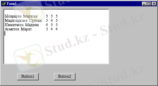 Ескерту . Формаға Button1, Button2 компоненттерiн орнатып (4. 1-сурет), файлды жазу, файлды оқу процедураларын олардың OnClick оқиғаларын өңдеуiш ретiнде код терезесiне енгiзiлетiн бiр программаға жазуға да болады.