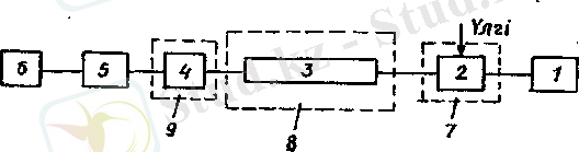 15. 3-сурет. Газдық хроматографтың блок-схемасы: У-тасымалдаушы газы бар баллон, 2-дозатор, 3-бағана, 4-детектор, 5-тіркегіш, 6-есептсгіш құрал (интегратор), 7-9-термостаттар.