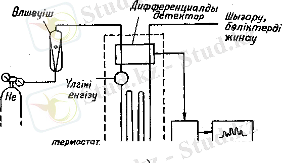 Балоннан (1) шыққан газ тасымалдауыш түрақты жылдамдықпен хроматографиялық жүйе арқылы өтеді. Сынаманы хроматографияланатын заттың толық булануына қажет болатын температураға дейін қыздырылған буландырғышқа (2) енгізеді. Талданатьш қоспа буын газ-тасымалдаушы ағьшымен ілестіре кетіп, оны термостат әдістеме бойынша қажет температурадағы термостатқа орнатылған бағана жеткізеді. Бағанадағы талданатын қоспа қүрамдас бөліктерге жіктелінеді де олардың әрқайсысы жеке-жеке детекторға енеді. Детектордың сигналы әуелі тіркеліп, интегратормен не микропроцессормен өнделінеді.