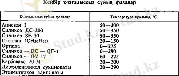 Қозғалыссыз сүйық фаза материалдарының басым көпшілігі балауыз, каучук немесе шыны сияқты масса болып келеді де ГСХ-бағаналардың да температурасы кезінде сұйытылады. Оларды полюстік дәрежесі мен шекті жұмысшы температурасы бойынша ажыратады. Талдау мәселесін шешуде көптеген сүйықтардың кең таралған, жиі қолданылатын әрі әмбебап түрлері 1-кестеде жинақталған.