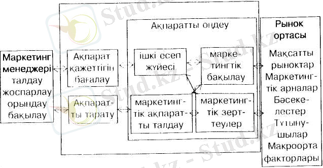 Маркетингтік ақпараттық жұйесі тұлғалар, неше түрлі құралдар жөніндегі және маркетингтік шешім қабылдауға қажетті сенімді акпаратты жинау, сұрыптау, талдау, бағалау әдістерін қамтиды. (9 - сурет)