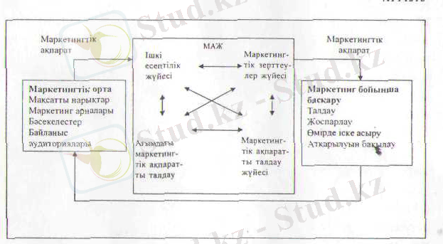 Сол жақтағы төртбұрышта маркетиягтік ортаның құрамдары көрсетілген. Маркетиңг жөніндегі меңгеруші оларды үнемі қадағалап отыруы тиіс. Ақпаратты төрт көмекші жүйенің көмегімен жинақтайды және талдайды. Осы жүйелер маркетингтік ақпарат жүйесін құрайды: ішкі есеп беру жүйесі, ағымдағы сыртқы мар-кетингтік ақпаратты жинақтау жүйесі, маркетингтік зерттеулер жүйесі, маркетингтік ақпаратты талдау жүйесі. Ол маркетинг жөніндегі басқарушыға кейін келіп түсетін ақпарат легі, оны талдау, маркетингтік шараларды жоспарлауды жүзеге асыру және орындал-уын бақылау ісінде көмектеседі. Нарыңқа бағытталған кері әсер басқарушы қабылдаған шешімдер мен өзге коммуникациялардан құралады.