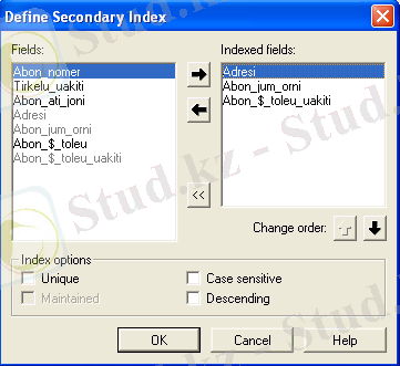 Жаңа индексті анықтау үшін, Define батырмасын басамыз. Көрінген диалогтық терезеде Fields өрісінде біз анықтаған кестенің тізім мазмұны көрсетіледі. Index Fields өрісінде құрылған индекске кірушілерді сақтау үшін тағайындалған. Fields тізімінен Index Fields тізіміне нақтылы өрісті көшіріп алу үшін оң бағдарша бейнелеуі бар батырманы басу керек. Өріске тізімді жүйелілі қосу маңызды, өйткені ол тізімде өрістің алмасу ретін анықтайды. Index Fields тізіміне керек өрістерді таңдаған соң ( сурет. 7), Ok батырмасын басамыз .